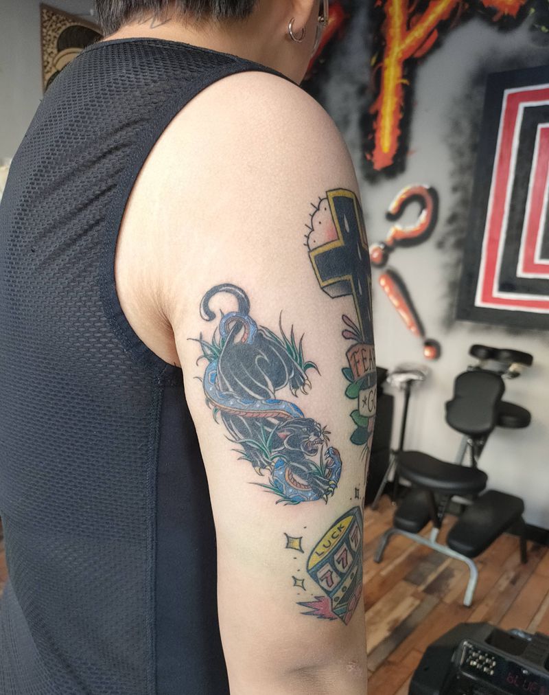 当前位置: 首页 >内蒙古赤峰市纹身店-回山刺青纹身图案>黑豹纹身图片_肩部Old School豹纹身图案