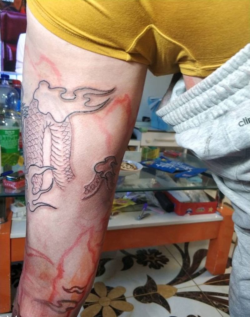 • T网红王老大花腿龙纹身图片_腿部新传统纹身图案