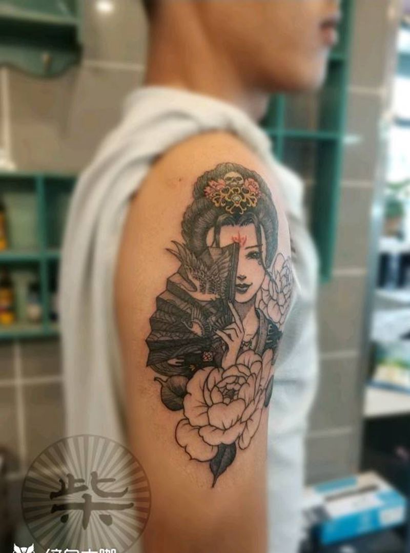 古风PLMM纹身图片_手臂新传统水彩艺伎纹身图案