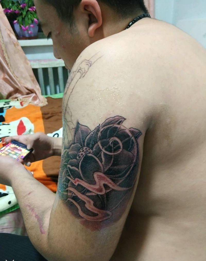 悟空荷花未完纹身图片_肩部老传统荷花纹身图案