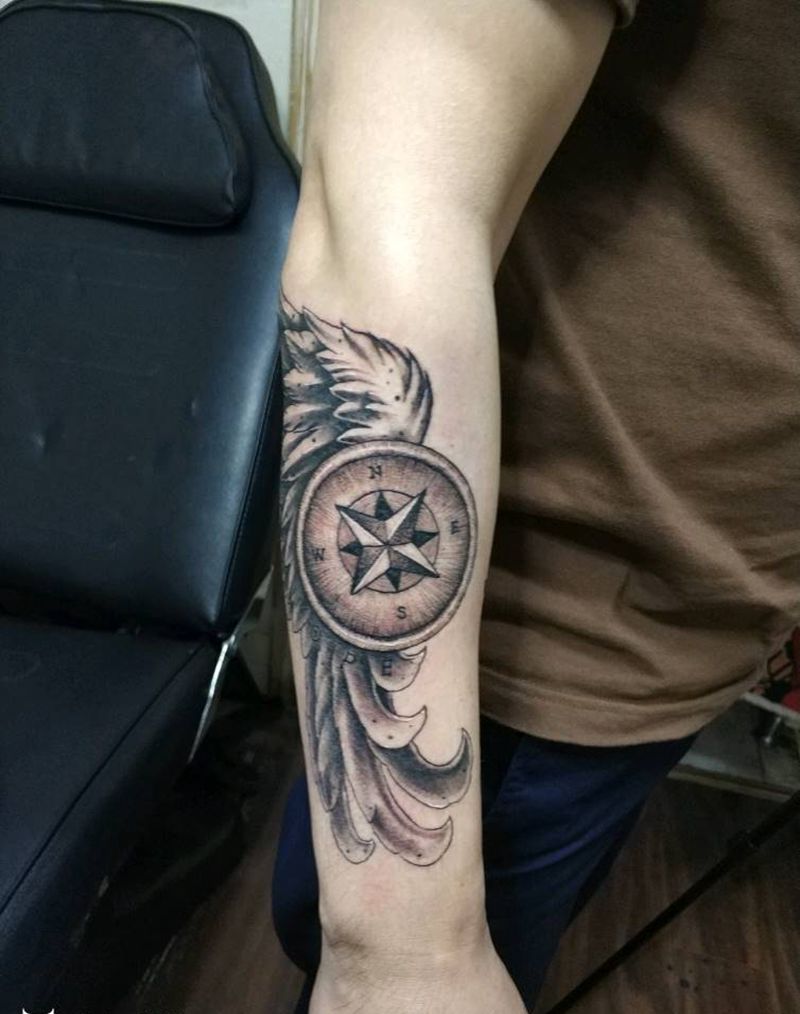 翅膀指南针纹身图片_手臂欧美写实点刺翅膀纹身图案