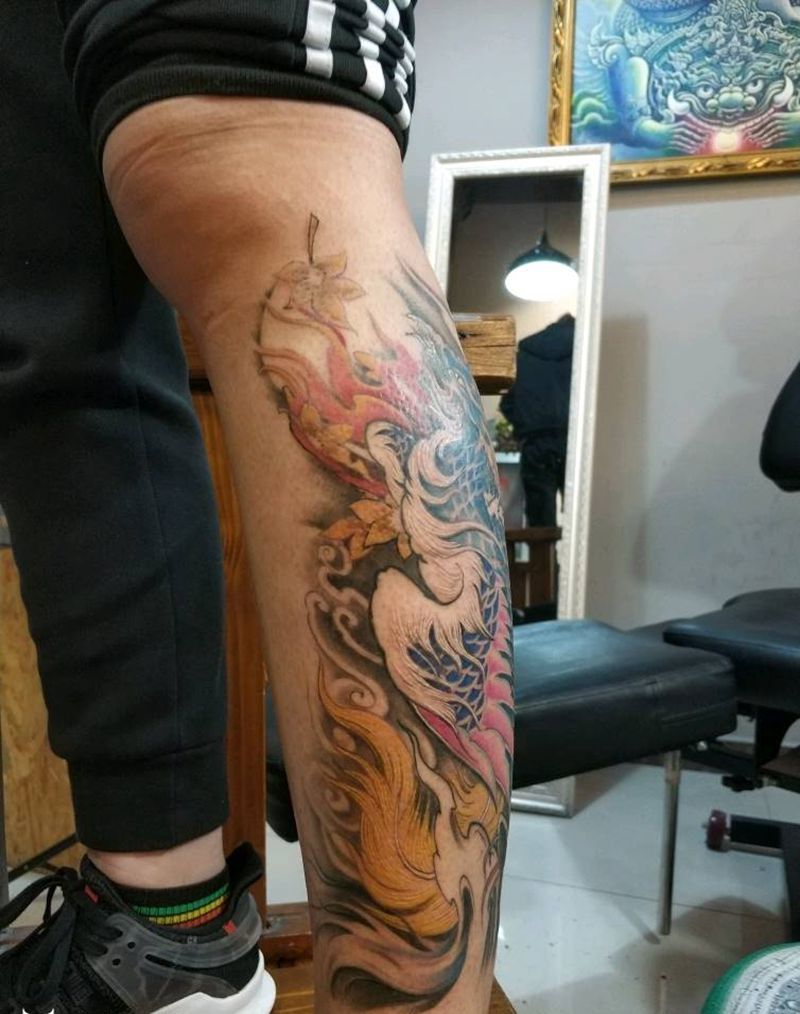 • T网红王老大花腿龙纹身图片_腿部新传统纹身图案