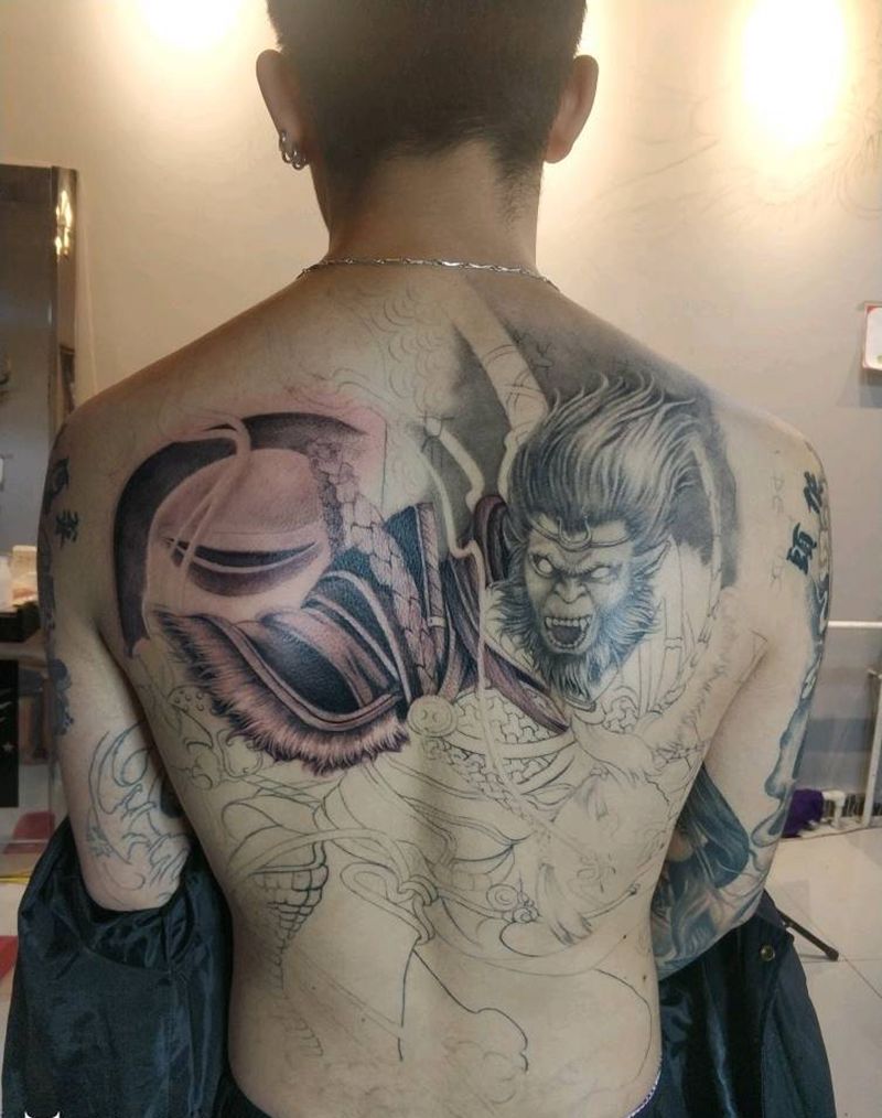 满背孙悟空斗战神佛纹身图片_背部老传统欧美写实斗战神佛孙悟空猴子纹身图案