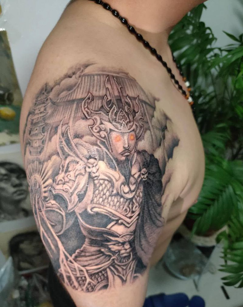 托塔天王李靖纹身图片_肩部新传统托塔天王纹身图案