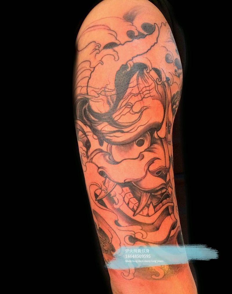 当前位置: 首页 >内蒙古通辽市纹身店-炉火纯青纹身纹身图案>般若包大臂黑灰底色纹身图片
