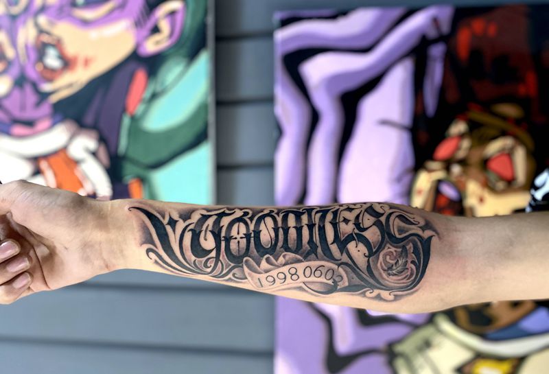 当前位置: 首页 >内蒙古鄂尔多斯市纹身店-锋哥的刺青店纹身图案>花体字纹身图片_手臂花体字纹身图案