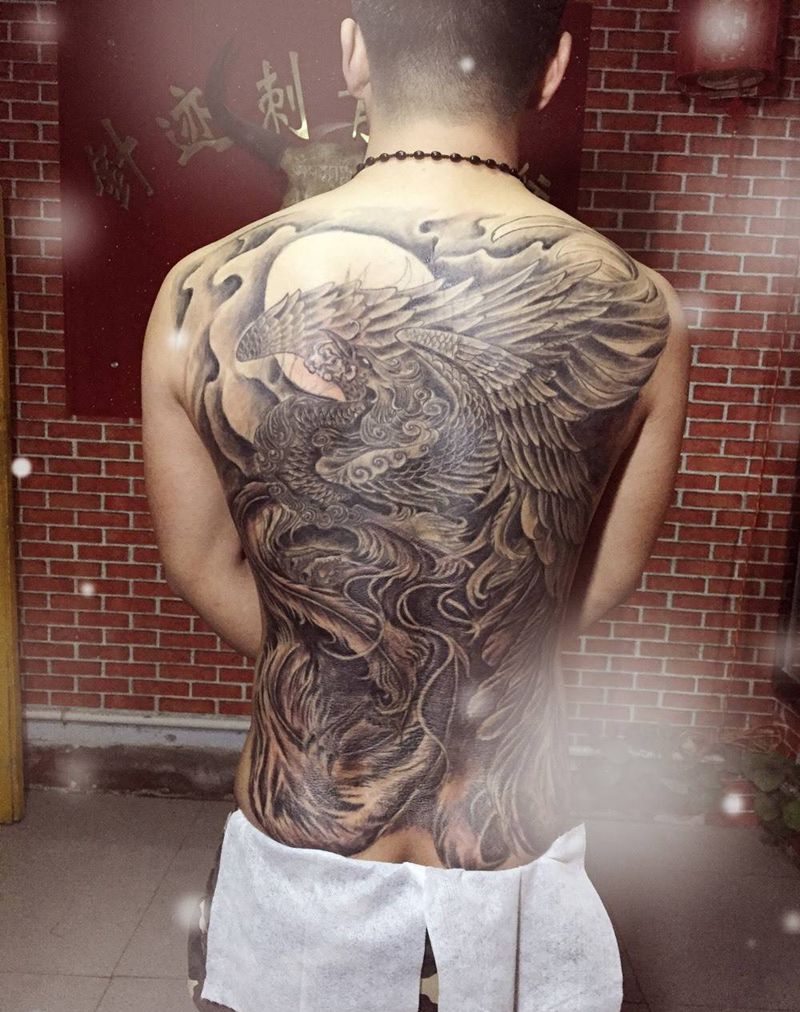当前位置: 首页 >内蒙古通辽市纹身店-通辽针迹刺青纹身图案>凤凰上色 别的店纹的线条纹身图片