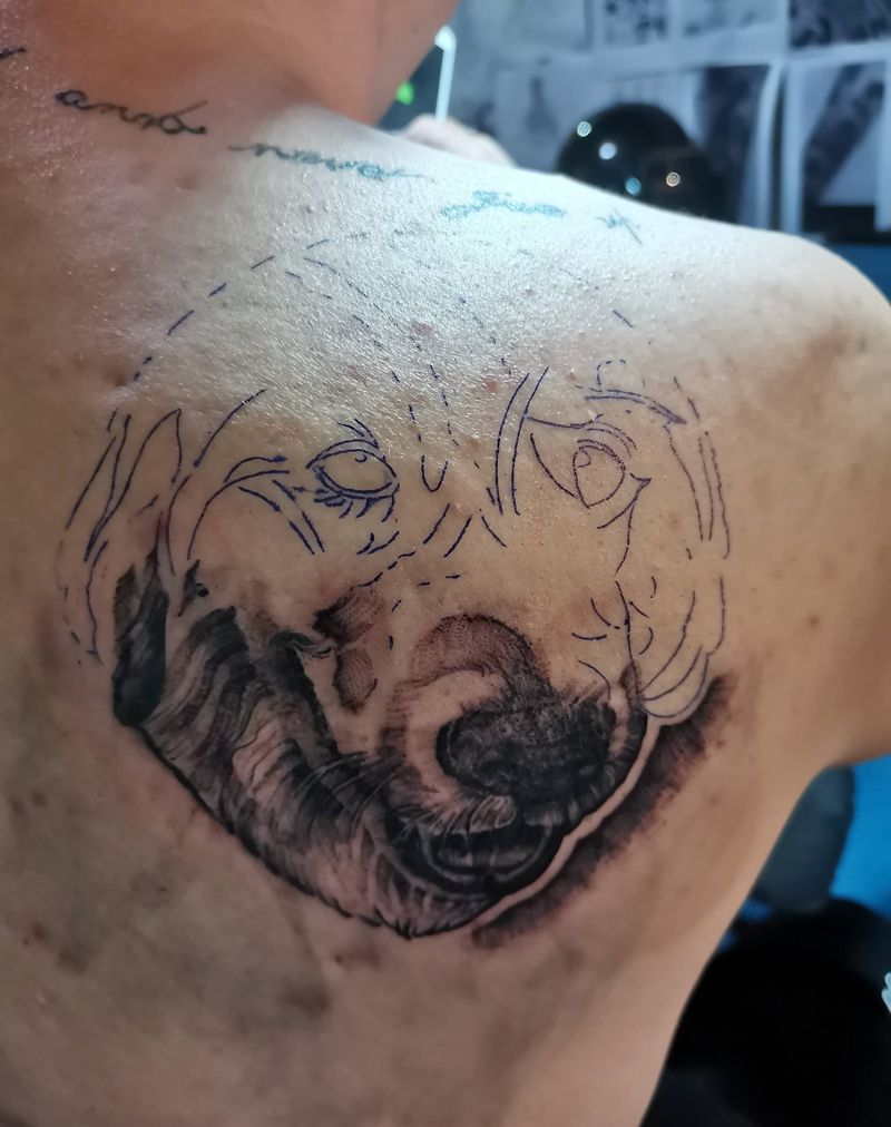当前位置: 首页 >内蒙古鄂尔多斯市纹身店-乌兰镇半墨刺青纹身馆纹身图案>爱犬肖像纹身图片_背部欧美写实纹身图案