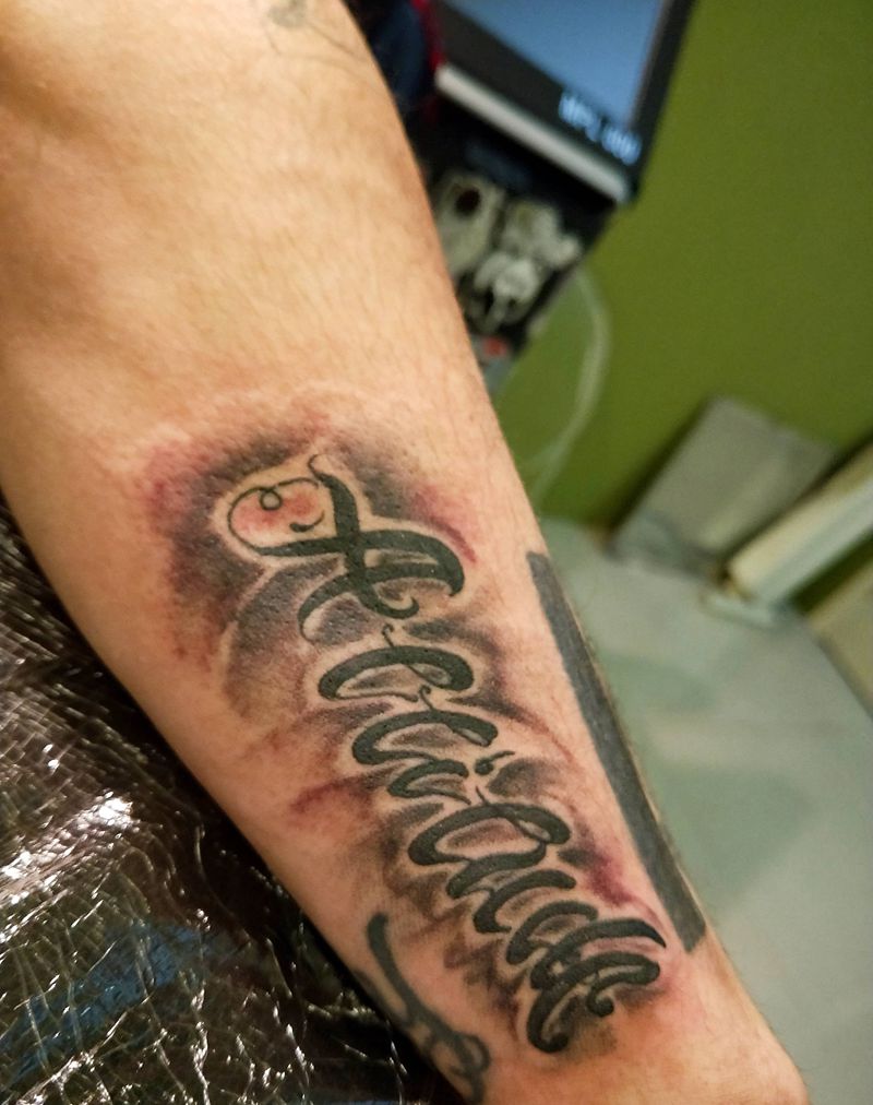 当前位置: 首页 >内蒙古鄂尔多斯市纹身店-乌兰镇半墨刺青纹身馆纹身图案>态度纹身图片_手臂花体字纹身图案