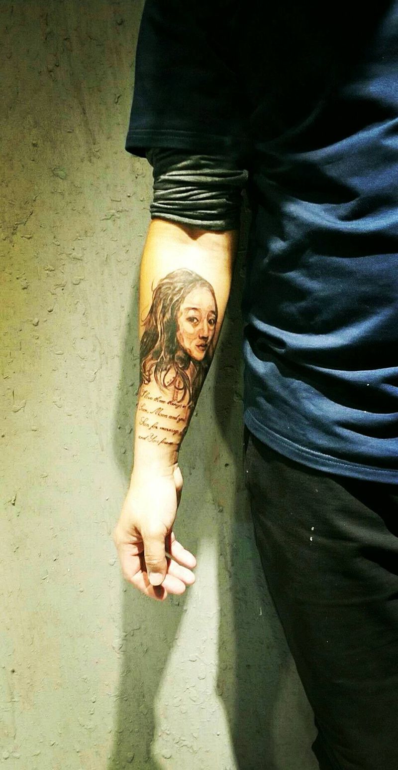 当前位置: 首页 >内蒙古鄂尔多斯市纹身店-乌兰镇半墨刺青纹身馆纹身图案>爱妻照片纹身图片_手臂欧美写实花体字纹身图案