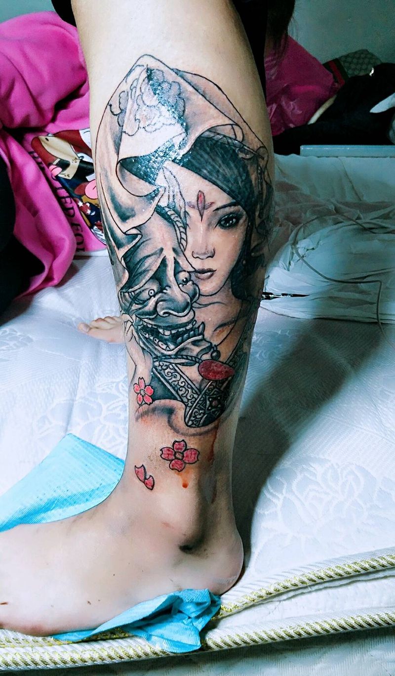 • T包小腿吹火男+阿多福纹身图片_腿部老传统新传统吹火男阿