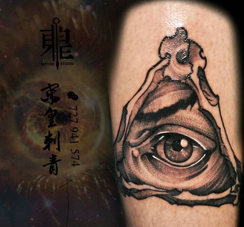 甩针风格上帝之眼纹身图片_腿部欧美清新鬼神上帝之眼甩针成品纹身图案