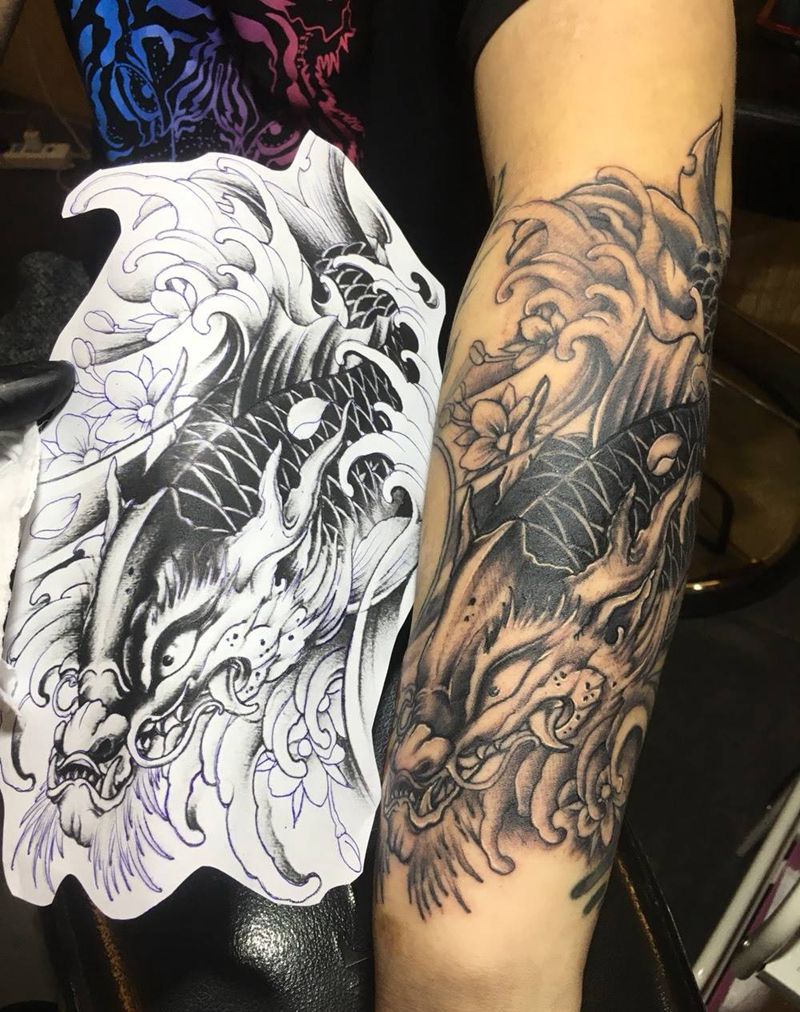 当前位置: 首页 >内蒙古锡林郭勒盟纹身店-青雲刺纹身图案>鳌鱼纹身图片_手臂传统动物未完纹身图案