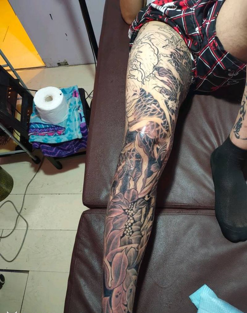 • T网红王老大花腿龙纹身图片_腿部新传统纹身图案