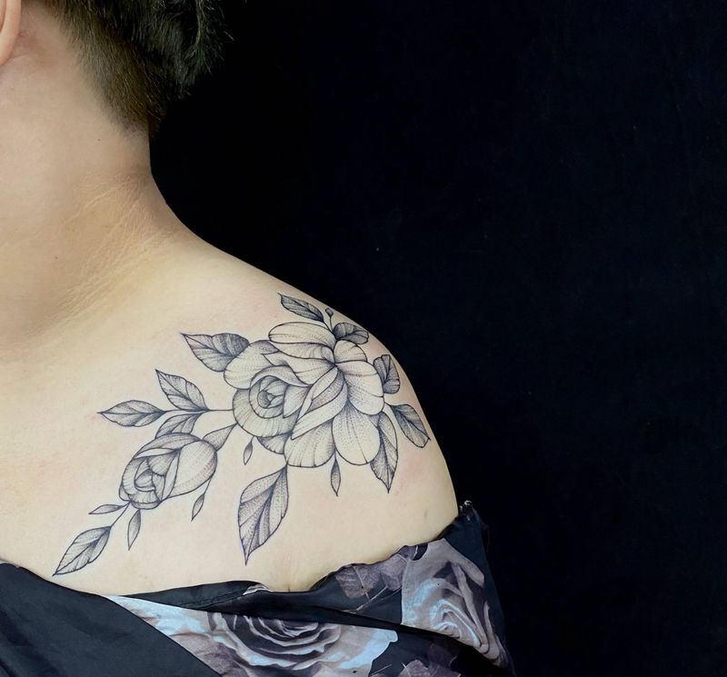 店内工作 素花纹身图片_肩部点刺纹身图案