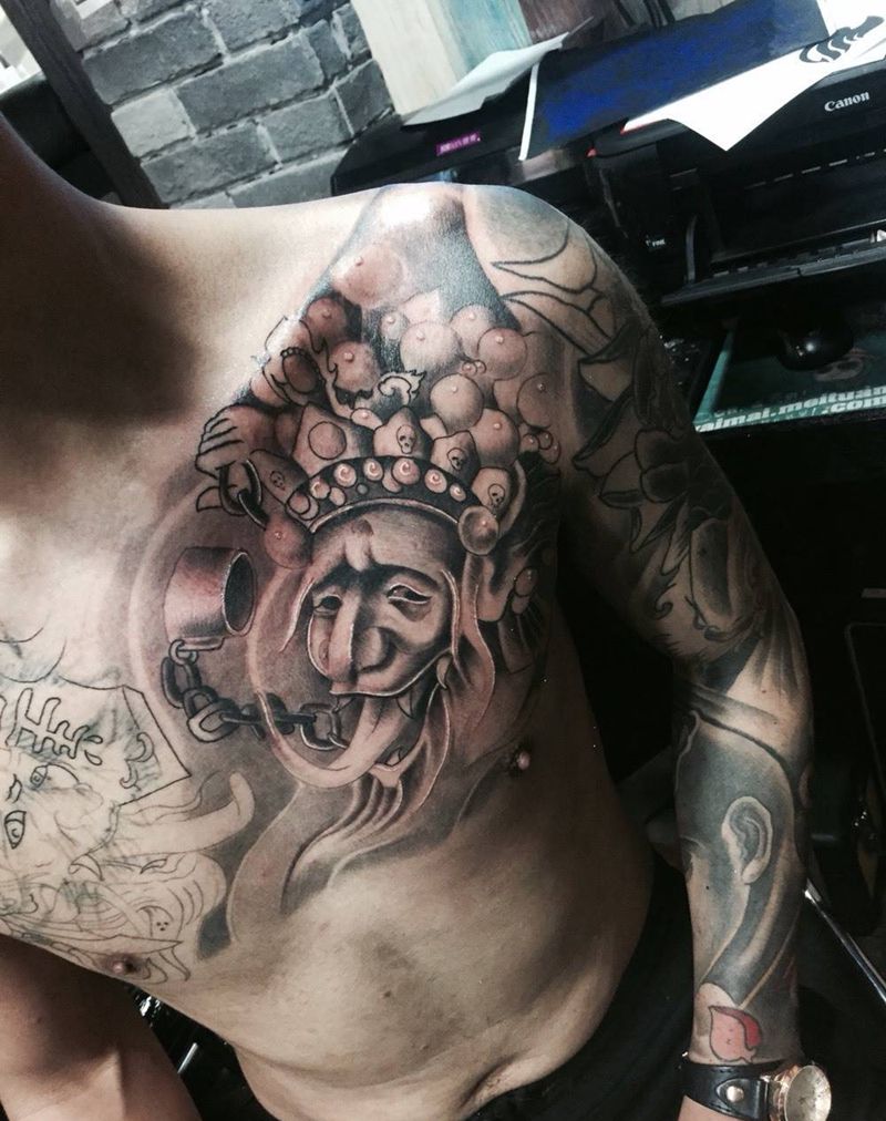 当前位置: 首页 >辽宁省沈阳市纹身店-沈阳彩艺刺青纹身图案>黑白无常纹身图片_成品胸部人物传统纹身图案