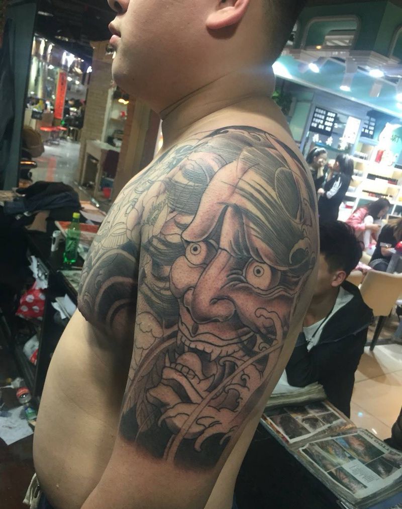当前位置: 首页 >辽宁省沈阳市纹身店-沈阳彩艺刺青纹身图案>黑灰般若纹身图片_肩部胸部成品传统鬼神纹身图案