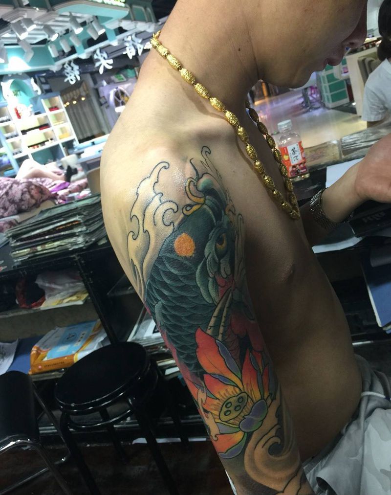 当前位置: 首页 >辽宁省沈阳市纹身店-沈阳彩艺刺青纹身图案>传统锦鲤纹身图片_成品肩部传统动物纹身图案