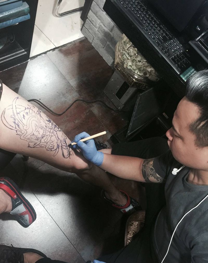 • T网红王老大花腿龙纹身图片_腿部新传统纹身图案