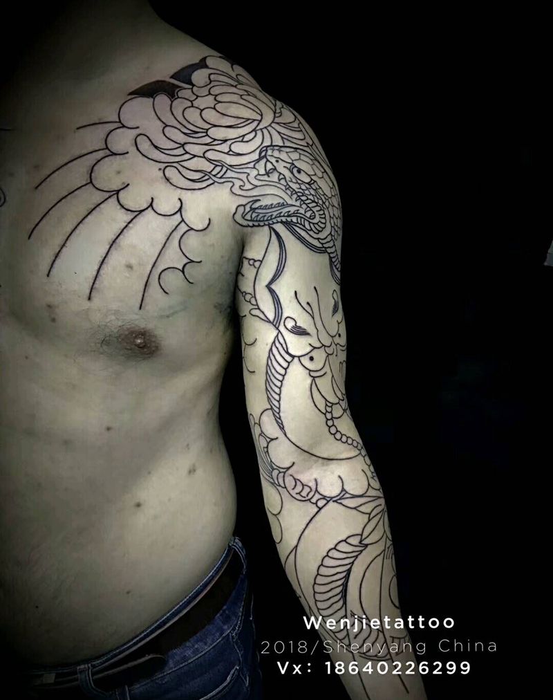 当前位置: 首页 >辽宁省沈阳市纹身店-沈阳彩艺刺青纹身图案>老传统般若菊花基础线纹身图片_手臂老传统纹身图案