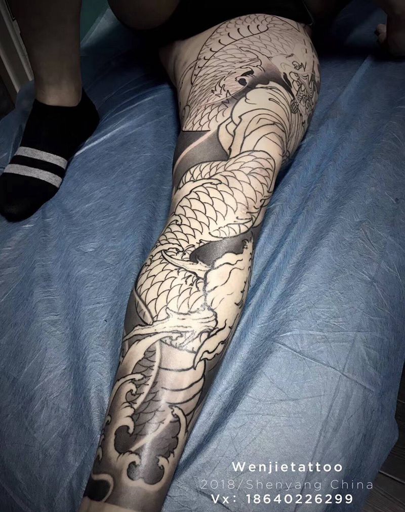 • T网红王老大花腿龙纹身图片_腿部新传统纹身图案