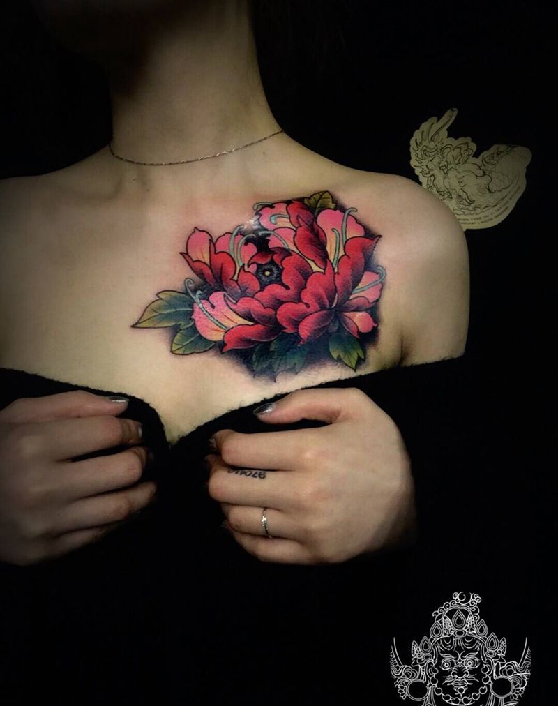 锁骨牡丹花,遮盖作品纹身图片_肩部胸部新传统纹身图案