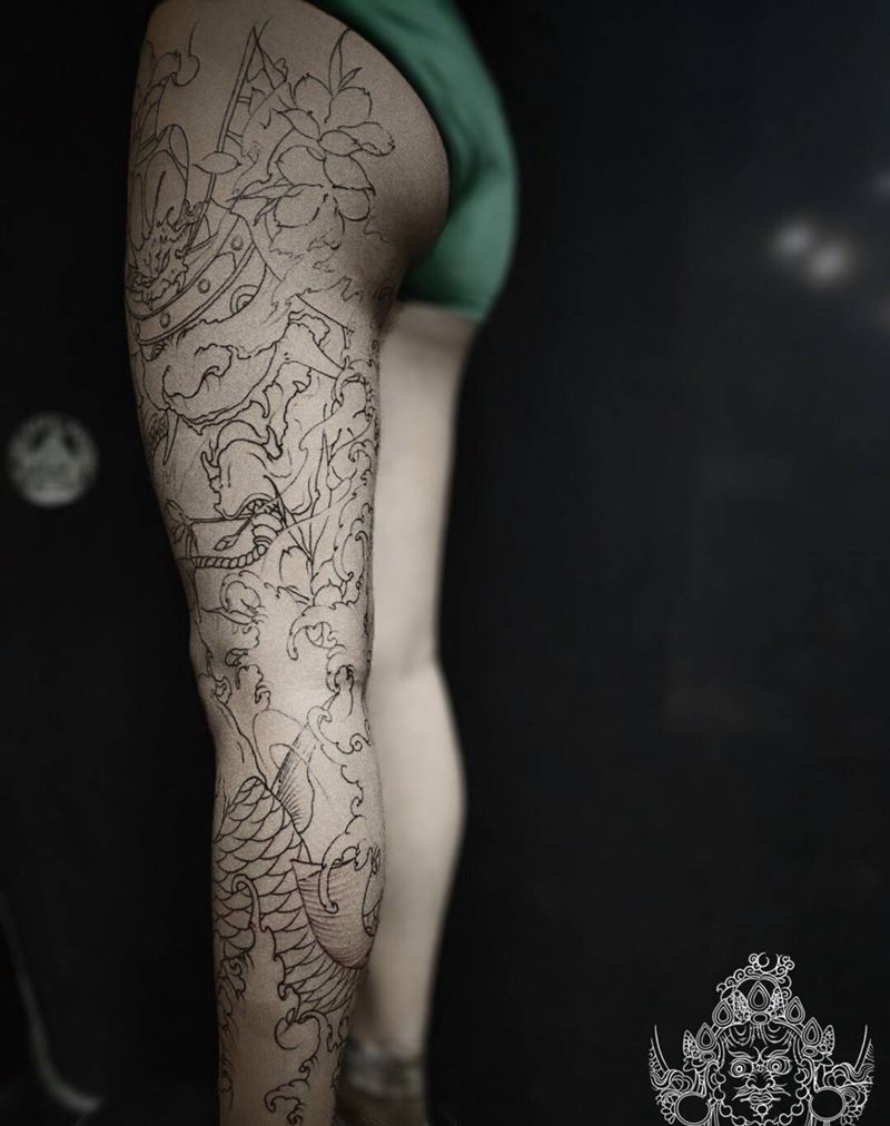 当前位置: 首页 >辽宁省沈阳市纹身店-沈阳彩艺刺青纹身图案>新传统花腿基础线纹身图片_腿部新传统纹身图案