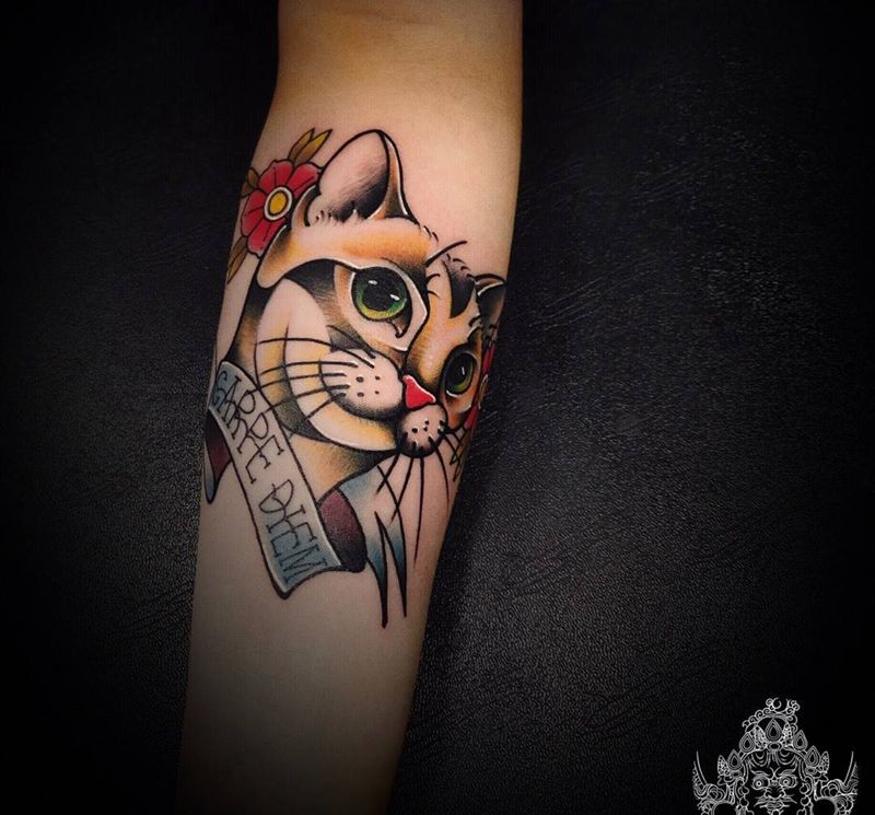 当前位置: 首页 >辽宁省沈阳市纹身店-沈阳彩艺刺青纹身图案>oldschool猫咪纹身图片_手臂Old School纹身图案