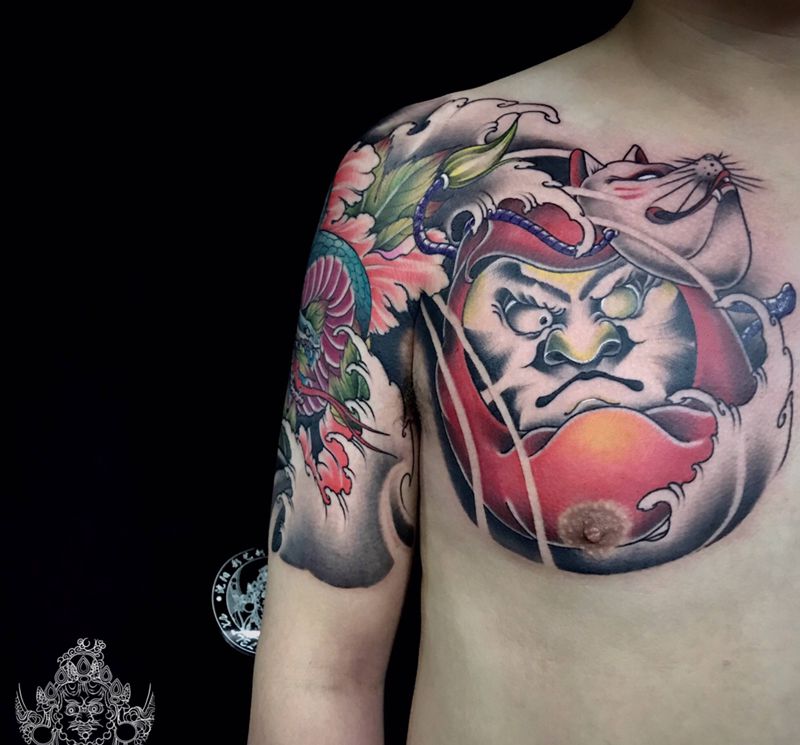 当前位置: 首页 >辽宁省沈阳市纹身店-沈阳彩艺刺青纹身图案>店内作品   新传统半甲纹身图片_手臂胸部新传统纹身图案