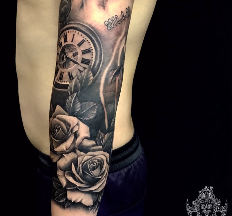 当前位置: 首页 >辽宁省沈阳市纹身店-沈阳彩艺刺青纹身图案>店内作品 七分花臂纹身图片_手臂欧美写实纹身图案