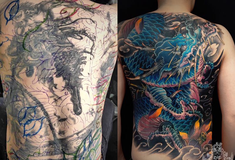 当前位置: 首页 >辽宁省沈阳市纹身店-沈阳彩艺刺青纹身图案>店内 遮盖作品纹身图片_背部新传统纹身图案