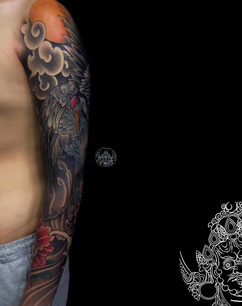 当前位置: 首页 >辽宁省沈阳市纹身店-沈阳彩艺刺青纹身图案>仙鹤花臂纹身图片_手臂新传统纹身图案