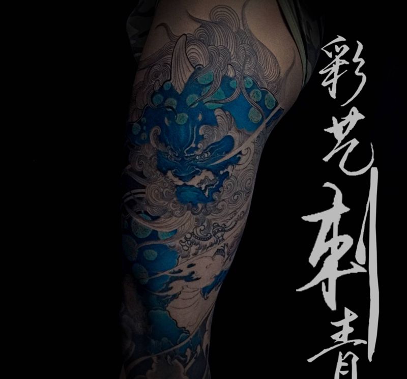 店内唐狮未完纹身图片_腿部新传统纹身图案