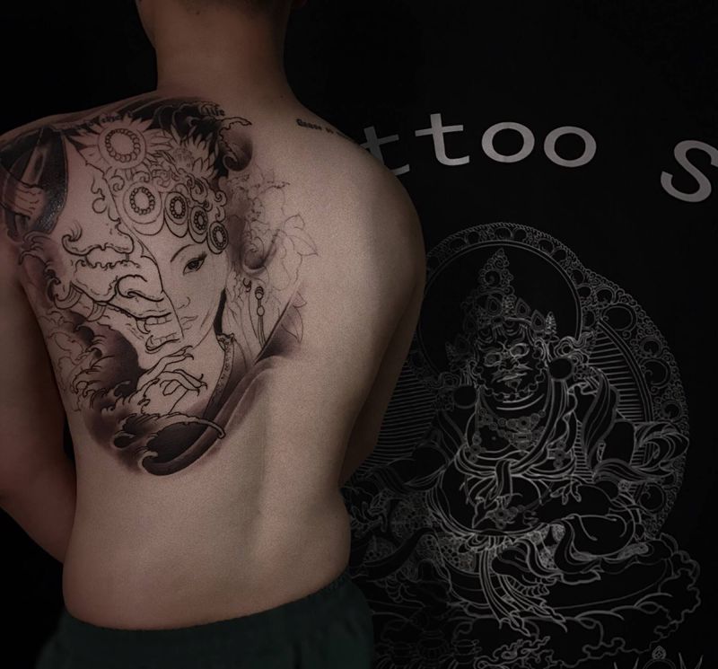 后肩艺妓未完纹身图片_背部新传统纹身图案