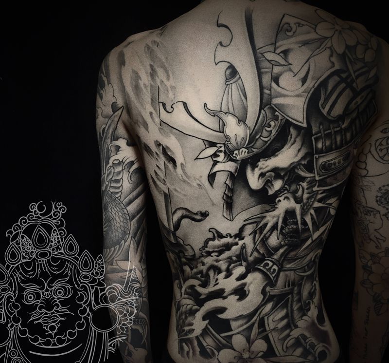 当前位置: 首页 >辽宁省沈阳市纹身店-沈阳彩艺刺青纹身图案>店内鬼武士纹身图片_背部新传统纹身图案