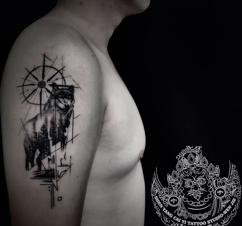 当前位置: 首页 >辽宁省沈阳市纹身店-沈阳彩艺刺青纹身图案>丛林中的狼纹身图片_手臂图腾点刺纹身图案