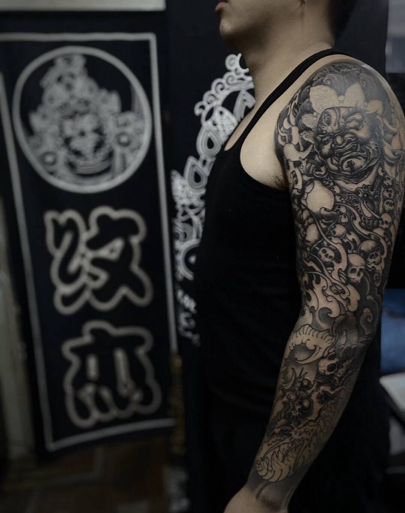 当前位置: 首页 >辽宁省沈阳市纹身店-沈阳彩艺刺青纹身图案>店内花臂未完纹身图片_手臂新传统纹身图案