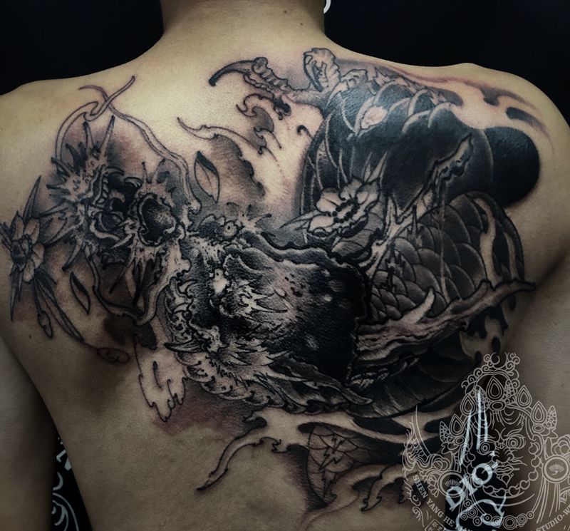 当前位置: 首页 >辽宁省沈阳市纹身店-沈阳彩艺刺青纹身图案>遮盖作品纹身图片_背部新传统纹身图案