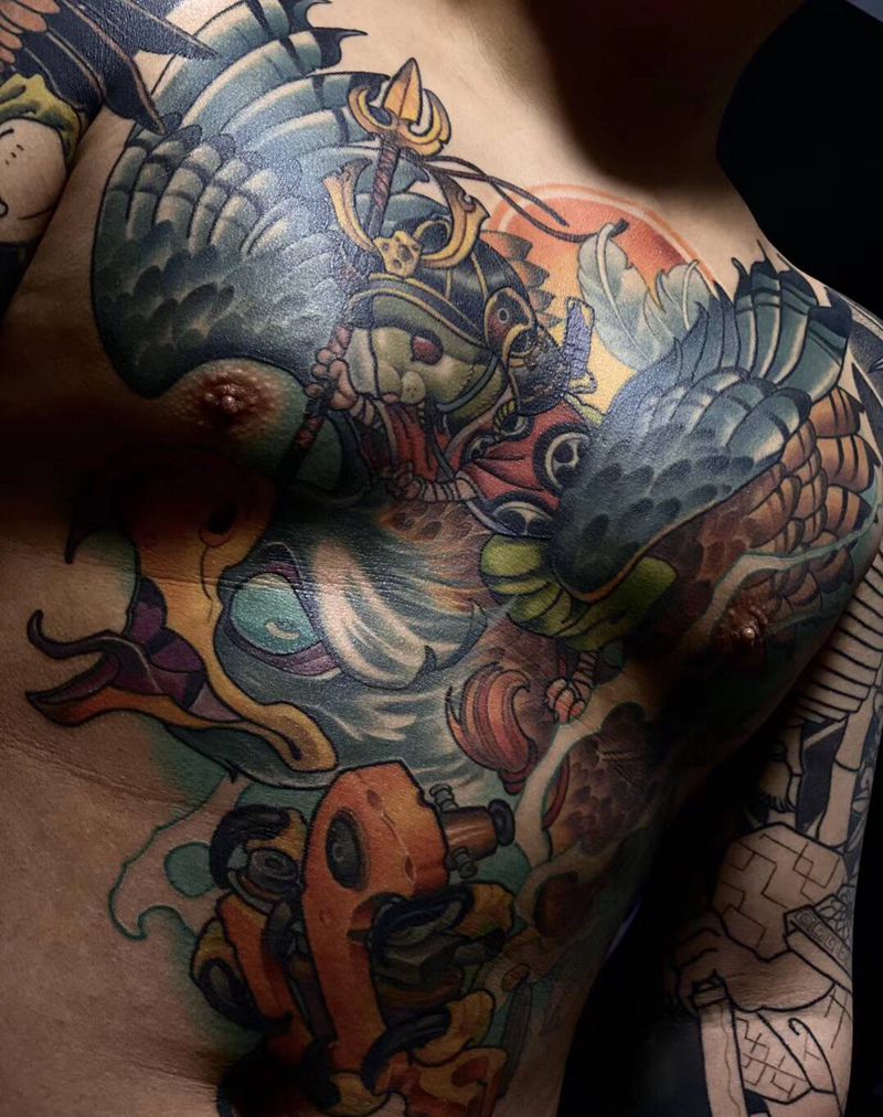 当前位置: 首页 >辽宁省沈阳市纹身店-沈阳彩艺刺青纹身图案>近期补拍颜色依然很亮纹身图片_胸部New School纹身图案