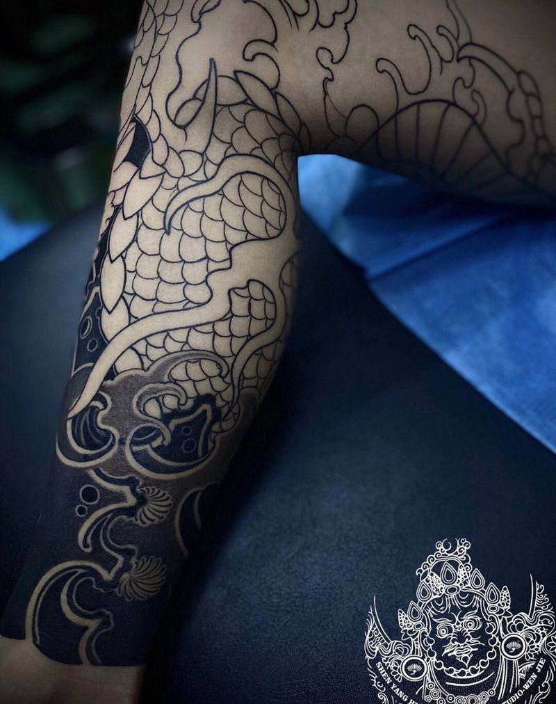 • T网红王老大花腿龙纹身图片_腿部新传统纹身图案