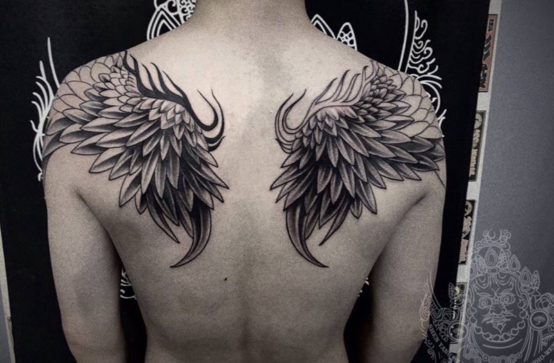 当前位置: 首页 >辽宁省沈阳市纹身店-沈阳彩艺刺青纹身图案>翅膀未完纹身图片_肩部图腾点刺纹身图案