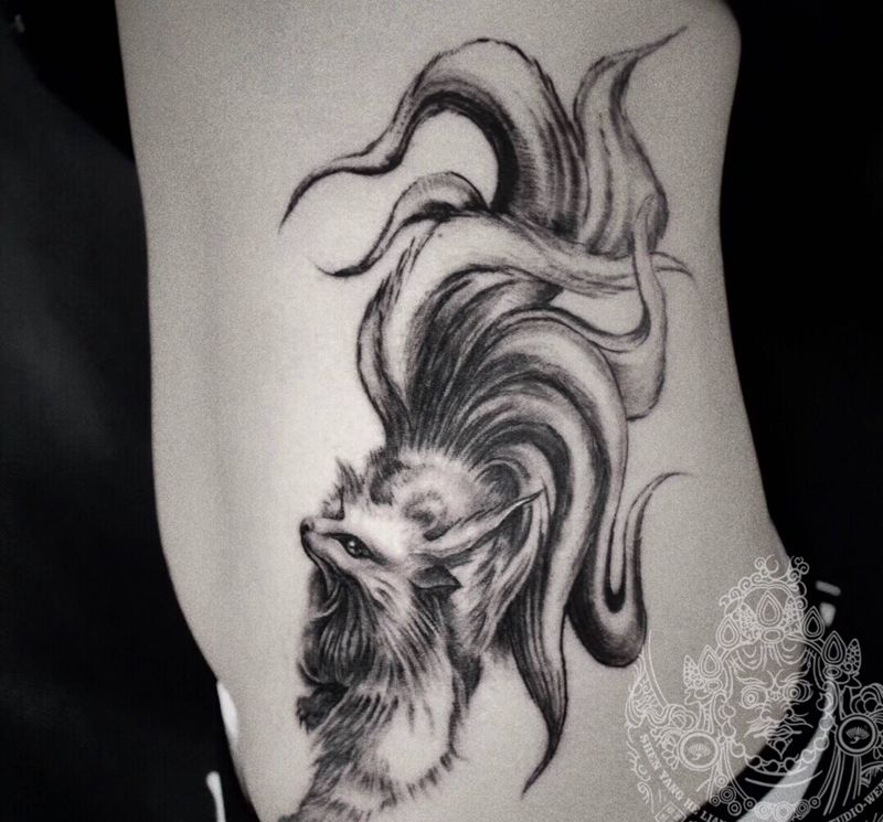 当前位置: 首页 >辽宁省沈阳市纹身店-沈阳彩艺刺青纹身图案>九尾狐纹身图片_腰部水墨图腾纹身图案
