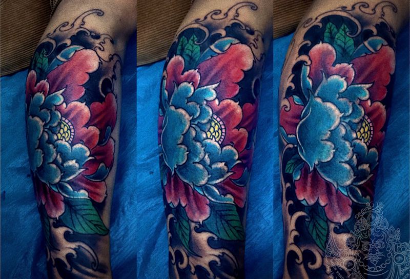 牡丹花遮盖纹身图片_腿部新传统纹身图案