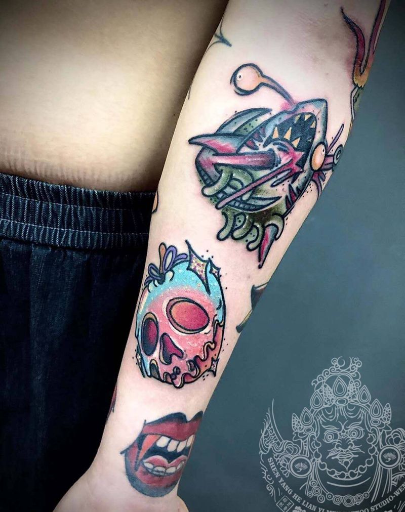 当前位置: 首页 >辽宁省沈阳市纹身店-沈阳彩艺刺青纹身图案>彩色小图纹身图片_手臂Old SchoolNew School纹身图案