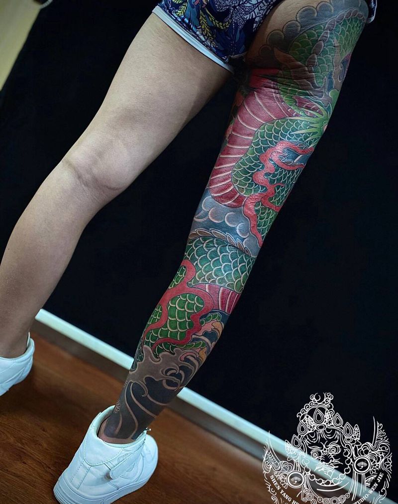 • T网红王老大花腿龙纹身图片_腿部新传统纹身图案