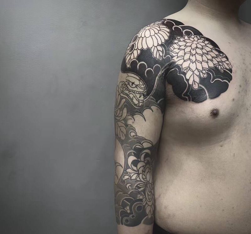 当前位置: 首页 >辽宁省沈阳市纹身店-沈阳彩艺刺青纹身图案>花与蛇 黑灰完成纹身图片_手臂新传统老传统纹身图案
