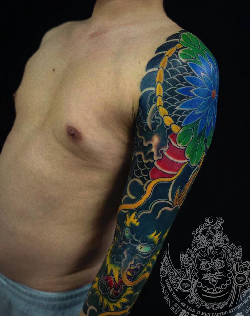 当前位置: 首页 >辽宁省沈阳市纹身店-沈阳彩艺刺青纹身图案>七分袖遮盖纹身图片_手臂老传统纹身图案