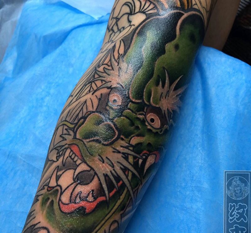 • T网红王老大花腿龙纹身图片_腿部新传统纹身图案