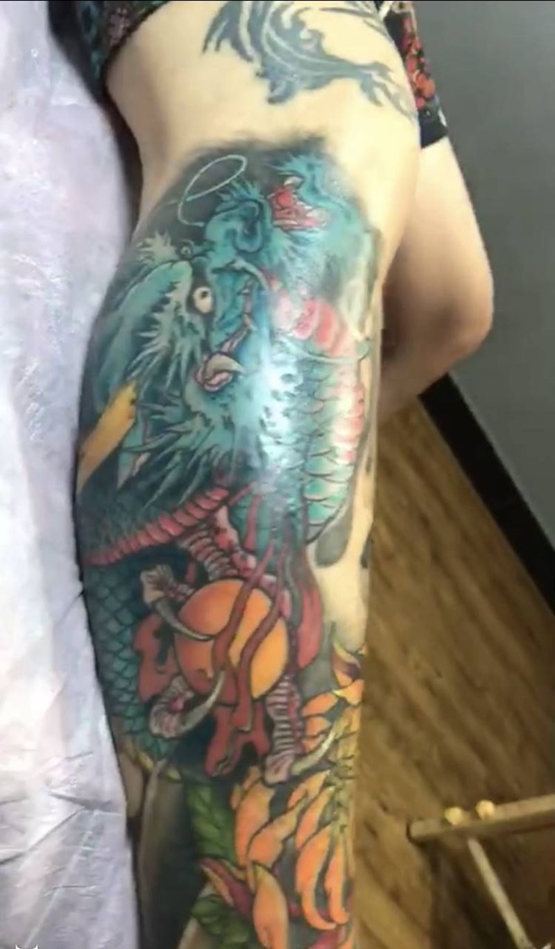 • T网红王老大花腿龙纹身图片_腿部新传统纹身图案