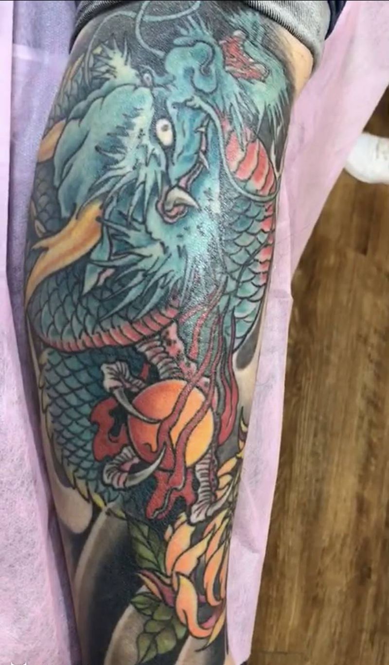 • T网红王老大花腿龙纹身图片_腿部新传统纹身图案